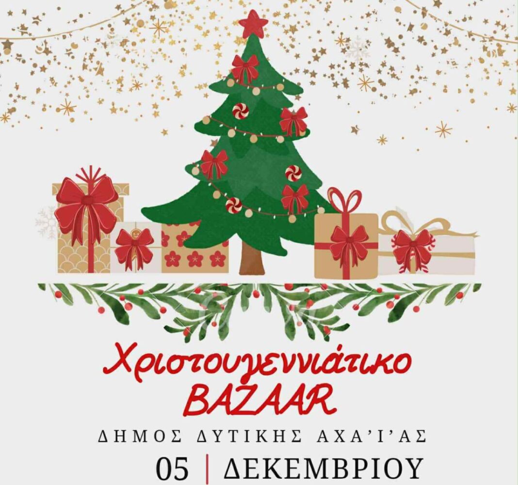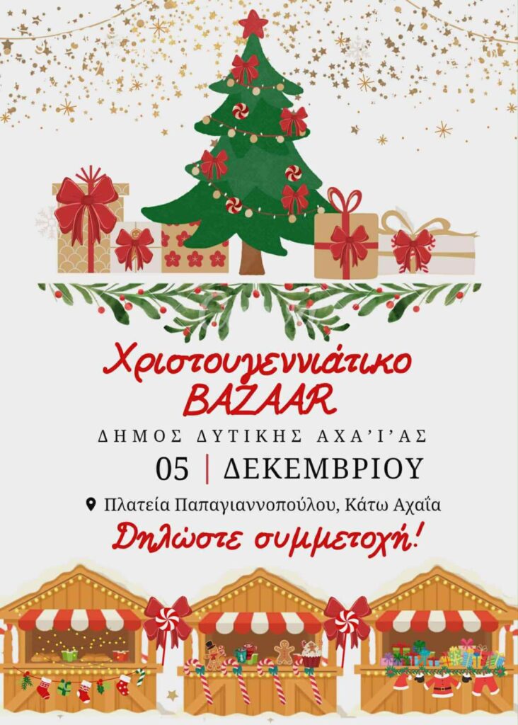 Ο Δήμος Δυτικής Αχαΐας προσκαλεί συλλόγους, φορείς, δημιουργούς και κατοίκους να συμμετάσχουν στο φετινό Χριστουγεννιάτικο Bazaar που θα στηθεί — όπως κάθε χρόνο — στην πλατεία Παπαγιαννοπούλου, στην Κάτω Αχαΐα. Οι γιορτινές εκδηλώσεις ξεκινούν την Παρασκευή 5 Δεκεμβρίου 2025, με τη λαμπερή φωταγώγηση του Χριστουγεννιάτικου δέντρου.