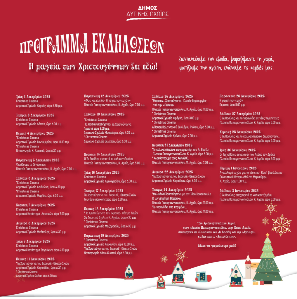 Ακολουθεί αναλυτικά το πρόγραμμα των εορταστικών εκδηλώσεων του Δήμου Δυτικής Αχαΐας για την περίοδο των Χριστουγέννων και της Πρωτοχρονιάς.